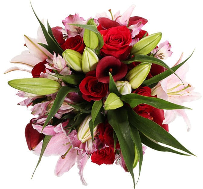 Celebrate love and elegance with our Crimson Rhapsody Bouquet, a vibrant and captivating floral arrangement that blends the rich hues of red and pink. Featuring stunning pink lilies, classic red roses, graceful red calla lilies, and delicate pink alstroemeria, this bouquet is a perfect expression of passion, admiration, and beauty.