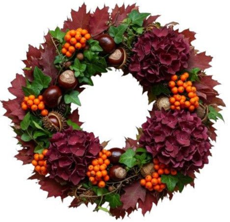- Burgundy Hydrangea: full and velvety, these blooms add depth, richness, and a touch of romance to the wreath.