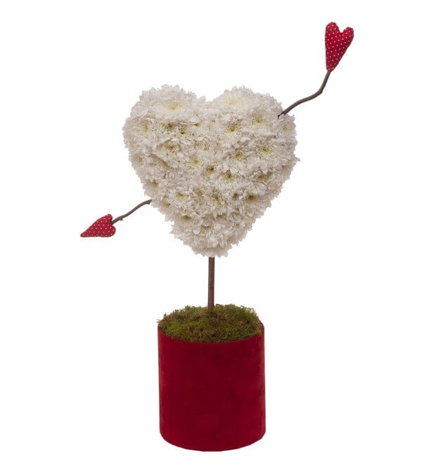 At the heart of this exquisite floral arrangement is a beautifully crafted cupid's arrow, symbolizing love, passion, and devotion. The arrow is delicately placed through the heart of white chrysanthemums, creating a striking and romantic visual that is sure to impress.