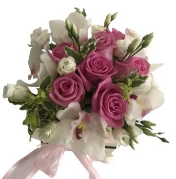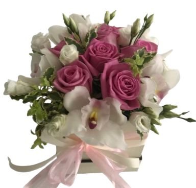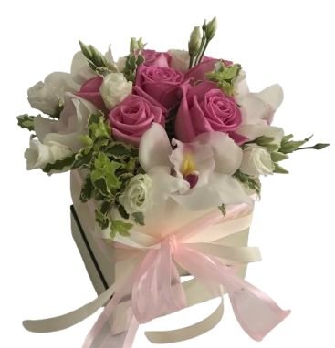 Delight in the elegance and charm of our Cute Box Roses and Cymbidium Orchids, featuring a stunning mix of pink roses, white cymbidium orchids blooms, and white lisianthus, accented with fresh pittosporum for added texture and greenery. This luxurious flowers arrangement brings together the soft romance of pink roses, the exotic beauty of cymbidium orchids, and the refined touch of white lisianthus, creating a unique and sophisticated gift.