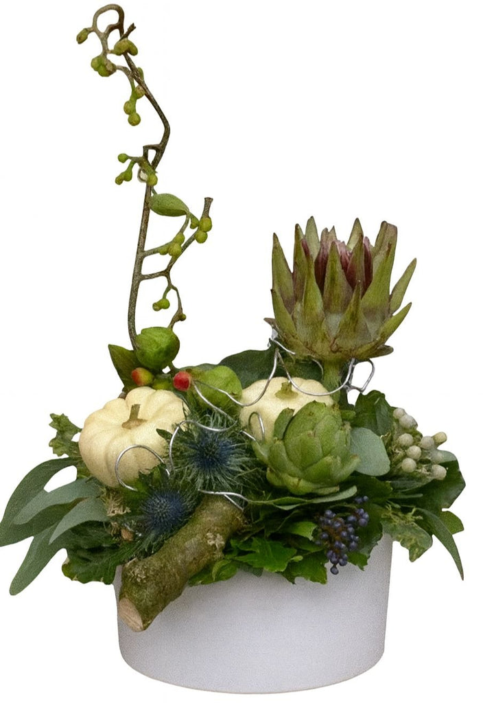 Celebrate Halloween with charm and sophistication with the Cute Halloween Box with Artichoke. This unique arrangement blends whimsical seasonal elements with natural textures, creating a modern and eye-catching display perfect for gifting or decorating during the spooky season. This creative halloween box is perfect for adding festive décor to your home, sending as a quirky seasonal gift, or surprising a loved one with a stylish take on spooky celebrations.