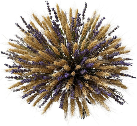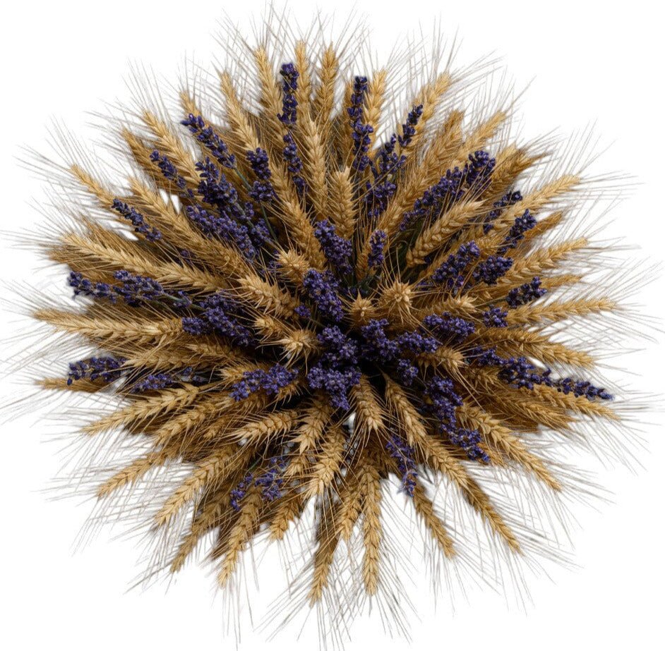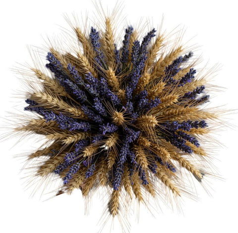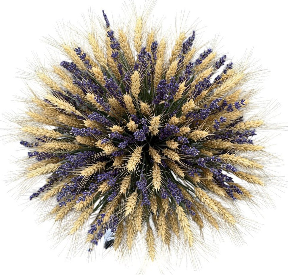 - Dried Weath: golden dried wheat adds warmth, texture, and rustic character to the bouquet. A symbol of abundance, prosperity, and renewal, it provides a lovely contrast to the lavender, balancing the arrangement with earthy tones.
