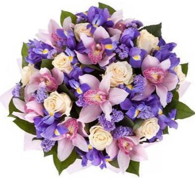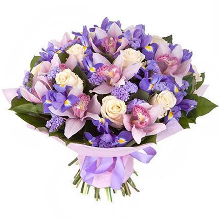 Experience the luxurious blend of colors and textures with our Cymbidium in Purple Bouquet. This exquisite arrangement combines the elegance of pink cymbidium orchids flowers with the classic beauty of ivory roses, the vibrant hue of blue iris, and the delicate charm of purple statice, all nestled in lush greenery.