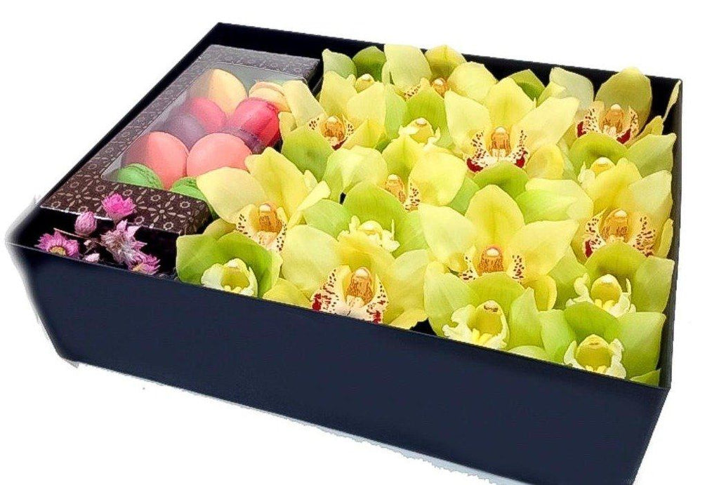 Spoil someone with this gorgeous and luxury box flowers with macarons set that will make anyone feel like royalty. A box of precious orchids complemented with a delicious and sweet macarons makes an elegant present perfect for any occasion.
