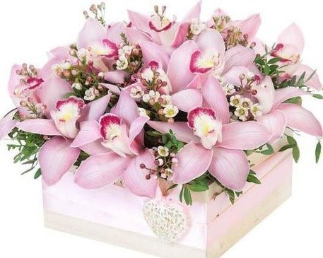 Experience the timeless beauty of cymbidium orchids, artfully arranged with a touch of sophistication. Our Cymbidium Orchids Box offers a choice of stunning orchid colors, accompanied by delicate white wax flowers and lush greenery, creating an exquisite gift for any occasion.