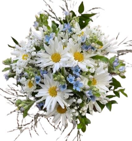 Whether given to celebrate a special occasion, express gratitude, good luck wish or simply to brighten someone's day, the Daisies with Blue Oxypetalum Bouquet is sure to make a memorable impression. Its combination of cheerful daisies and tranquil blue oxypetalum makes it a perfect choice for conveying warmth, joy, and heartfelt sentiment.