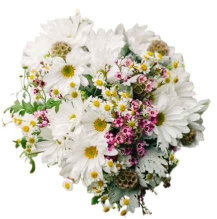- Daisies (Leucanthemum): are the heart of the bouquet, known for their iconic white petals and yellow centers. Daisies symbolize purity, innocence, and new beginnings, bringing a cheerful and uplifting touch to the arrangement. Their classic beauty adds a timeless and fresh feel to the bouquet.