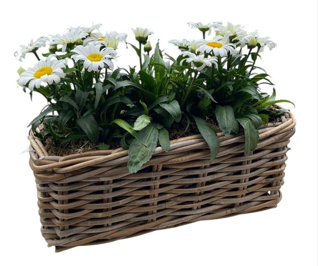 Presented in a rustic rattan basket, this potted plant makes a perfect gift or home décor accent. The combination of fresh greenery and a natural woven container creates a warm, inviting look ideal for patios, balconies, kitchens, or entryways. Symbolizing purity, innocence, and new beginnings, this gift is ideal for birthdays, housewarmings, or simply bringing joy to someone’s day. Expertly arranged for a natural and cozy look, it fits perfectly in any home or garden setting. Perfect for indoor or sheltered outdoor spaces, this daisy plant requires minimal upkeep and thrives in bright light.
