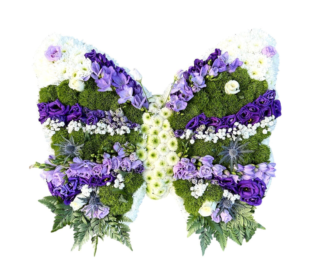 If you are looking for a unique funeral arrangement, i.e. a composition other than a traditional bouquet of flowers - butterfly funeral tribute. A dark funeral butterfly with the addition of white flowers to delicately brighten the compositions. The combination of lisianthus, chrysanthemum and roses gives a beautiful whole. It will certainly be a great funeral tribute.