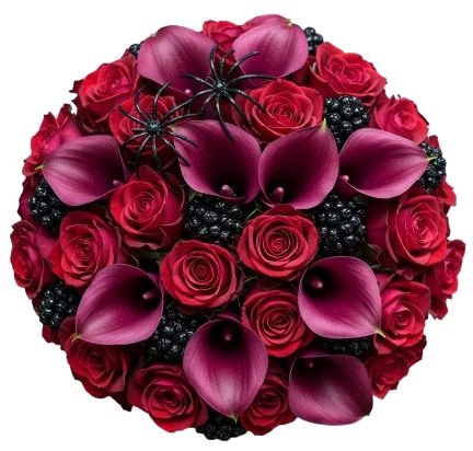 Perfect for those who appreciate romance with an edge, this bouquet is a statement of intensity, elegance, and depth of emotion. The velvety textures and rich hues create a sense of drama and intrigue, making it ideal for anniversaries, romantic gestures, or unforgettable celebrations. Every stem is arranged with precision to highlight the interplay between passion and mystery — from the sleek curves of the calla lilies to the lush fullness of the roses and the unexpected texture of the berries. Enhanced with the artistic spider décor, this bouquet stands out as a modern, avant-garde floral design.