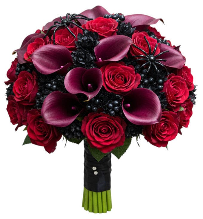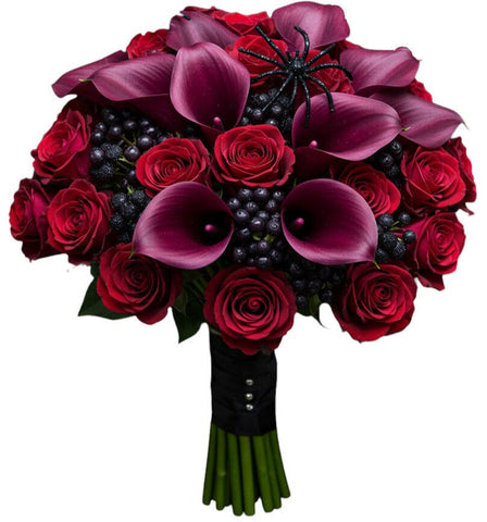 Unveil the passion and mystery of love with the Dark Romance in Bloom Bouquet, a dramatic arrangement designed to captivate and impress. This bold bouquet features the sultry elegance of burgundy calla lilies, the timeless allure of deep red roses, and the wild charm of black berries, all finished with a touch of unique spider décor for an enchanting, almost gothic flair.