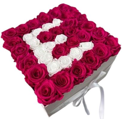 The Deep Purple and White Roses Initial Flower Box is a bespoke floral arrangement designed to make a lasting impression. Featuring a stunning combination of deep purple roses and white roses, this elegant creation is personalized with an initial, making it a truly unique gift for any occasion.