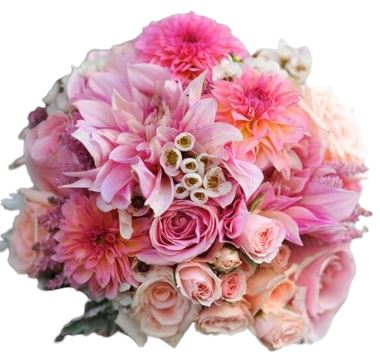 - Pink Spray Roses: with their smaller blooms, add a delicate and whimsical touch. These mini roses provide a sense of fullness and richness to the bouquet, complementing the larger pink roses and dahlias.