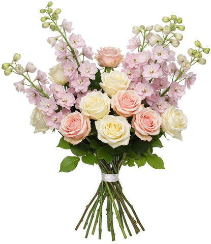 Soft, elegant, and beautifully balanced, our Delphinium with Pink and White Roses Bouquet is a graceful floral arrangement that exudes charm and sophistication. Featuring delicate pastel shades, this bouquet combines the timeless beauty of roses with the airy elegance of delphiniums, creating a romantic and uplifting gift for any occasion. Perfect for sending thoughtful congratulations or best wishes or creating an elegant centerpiece for any home or event.