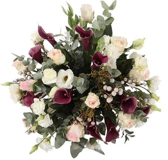 The Desert Rose Bouquet is a captivating arrangement that combines the delicate beauty of pink roses with the rich tones of burgundy calla lilies, complemented by the soft elegance of white lisianthus and the unique texture of silver brunia and eucalyptus.