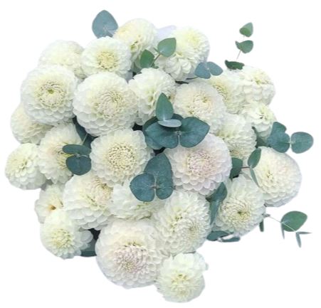 - Eucalyptus: complementing the dahlias is fragrant eucalyptus foliage, which adds texture and depth to the bouquet. The eucalyptus leaves, with their silvery-green hue and distinctive aroma, lend a touch of freshness and vitality to the arrangement. Not only do they complement the boldness of the dahlias, but they also provide a subtle contrast that enhances the overall beauty of the bouquet.