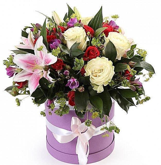 The Dignified Hat Box is a luxurious and sophisticated floral arrangement designed to make a lasting impression. Combining a beautiful selection of pink lilies flowers, white roses, red spray roses, purple freesias, and lush greenery, this elegant hat box offers an exquisite balance of color, texture, and fragrance, making it the perfect gift for any special occasion.