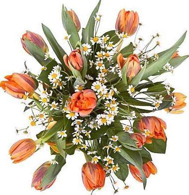 The Double Orange Tulips and Tanacetum Flowers form a beautiful bouquet that captures the essence of springtime with its vibrant colors and lively energy. Whether it's to celebrate a special occasion, Mother's Day or to simply brighten someone's day, this bouquet is sure to delight and enchant anyone who receives it.