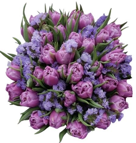 The luxurious double tulips add a touch of elegance, while the delicate purple limonium provides a soft, airy touch to the arrangement. This bouquet is ideal for any special occasion, including birthdays, anniversaries, or as a heartfelt thank-you or congratulations gift.