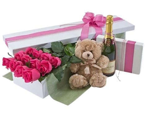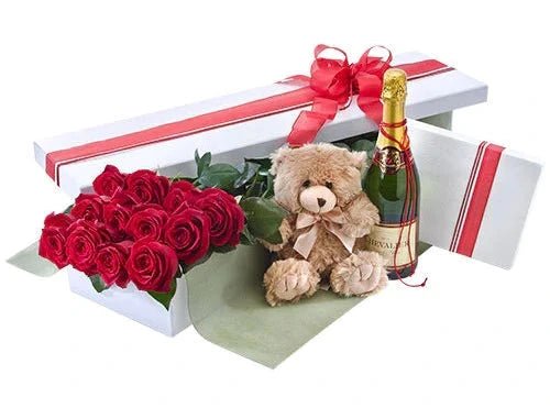 Show your love and affection in the most enchanting way with our Dozen Red Roses with Champagne and Teddy Bear gift set!