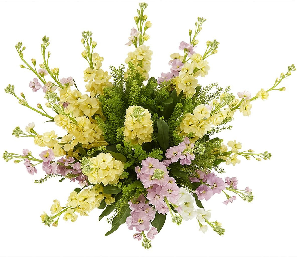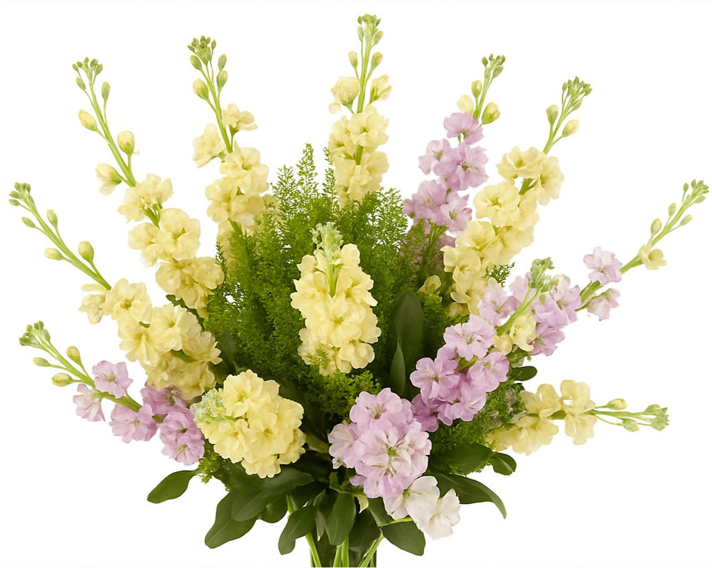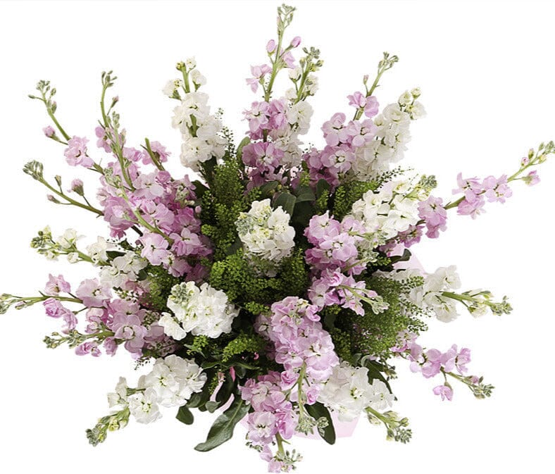Stock (colour to choose from): known for their delightful fragrance and lush clusters, stock flowers come in a variety of colors such as white, pink, purple, or lavender. Choose your favorite shade to personalize this bouquet.