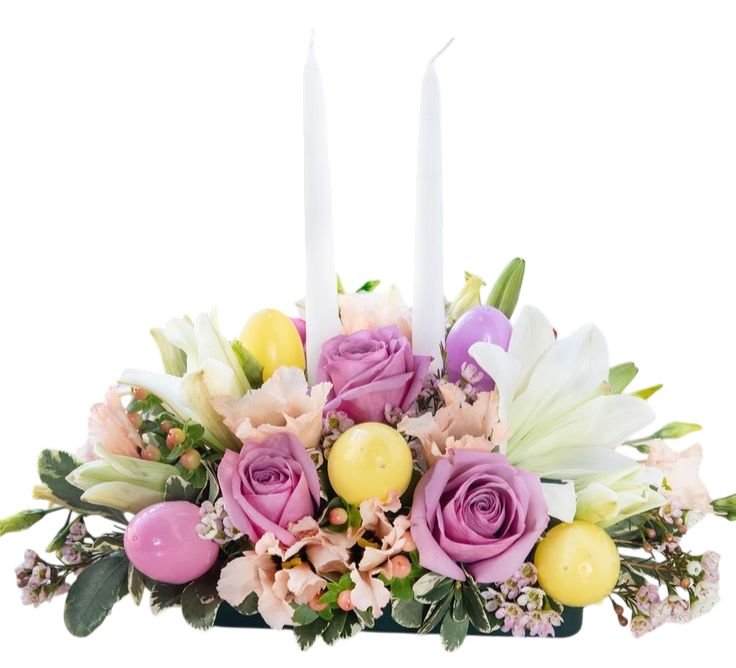 This Easter floral arrangement is a perfect way to embrace the spirit of the season, offering a blend of soft pinks and whites that symbolize purity, new beginnings, and the beauty of spring. The addition of the candles not only adds elegance but also creates a soothing ambiance, making it ideal for family gatherings, Easter brunches, or as a thoughtful gift for someone special.