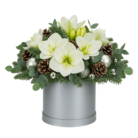 Bring refined holiday style into your home with our Elegant Holiday Box with Amaryllis & Silver Accents. This premium Christmas floral arrangement features a stunning amaryllis (with a colour of your choice), complemented by sparkling silver assorted baubles, rustic natural cones, aromatic eucalyptus, and lush fresh spruce for a beautifully layered winter design. Perfect as a luxury Christmas centerpiece, a stylish addition to your festive décor, or an unforgettable seasonal gift, this arrangement blends classic holiday greenery with modern silver detailing. The amaryllis adds dramatic elegance while the spruce and eucalyptus fill your home with a fresh winter scent. Handcrafted by skilled florists, this exclusive flower box elevates any holiday table, office reception, mantel, or gift exchange with its sophisticated seasonal charm.