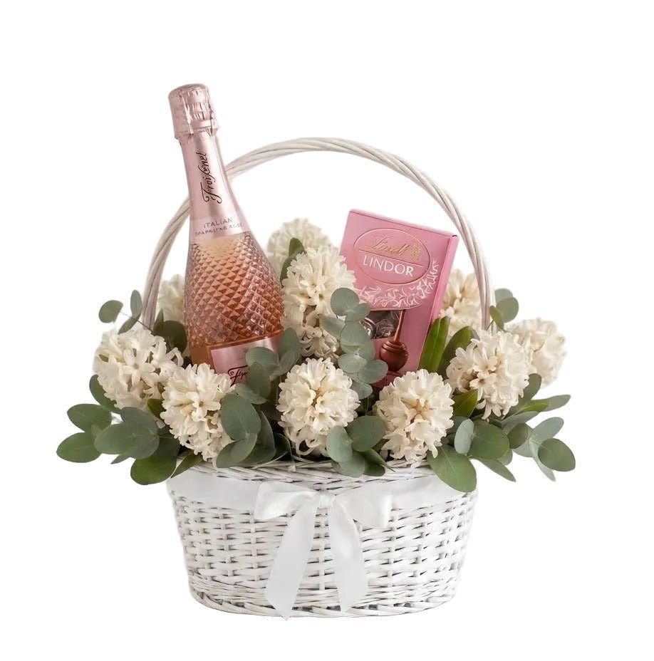 Celebrate in style with the Elegant Hyacinth Hamper with Wine and Chocolate from Flowers Box London. A beautiful mix of fragrant hyacinth, premium wine, and gourmet chocolates — perfect for birthdays, celebrations, or thoughtful gifting. Same-day delivery in London and next-day UK-wide.
