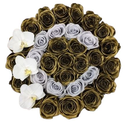 Indulge in the exquisite beauty of our Elegant Initial Box of Gold and Silver Roses featuring phalaenopsis orchids blooms. This luxurious floral arrangement combines the radiant shimmer of gold-painted roses, the delicate elegance of silver-painted roses, and the breathtaking allure of white phalaenopsis orchids. Each bloom is designed to create a stunning visual impact that will captivate and impress.