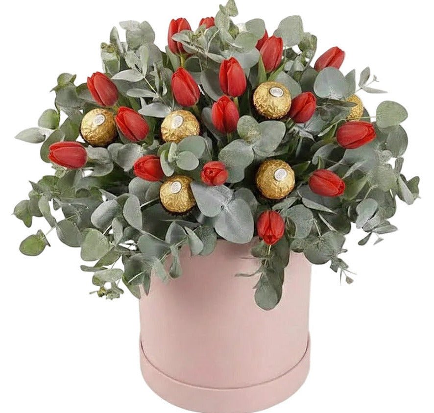 Order the Elegant Tulips and Eucalyptus Gift Box with Chocolates from Flowers Box London. This beautifully curated gift combines fresh, vibrant tulips with aromatic eucalyptus foliage and delicious premium chocolates, creating a perfect balance of elegance and indulgence. Ideal for birthdays, anniversaries, thank-you gifts, or special celebrations, this floral box offers both beauty and sweetness in one luxurious arrangement. Carefully handcrafted by expert florists and presented in a stylish box, it makes a memorable gift for loved ones. Enjoy fast and reliable delivery across the UK.