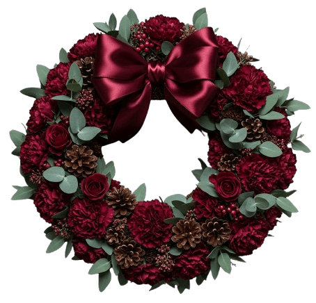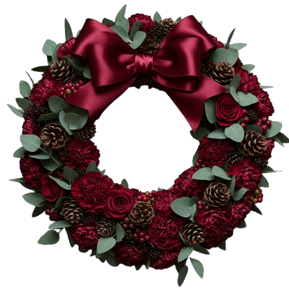 - Burgundy Carnations: these velvety blooms bring depth and richness to the wreath. Their deep burgundy color symbolizes admiration and affection, making them an elegant foundation for this design.