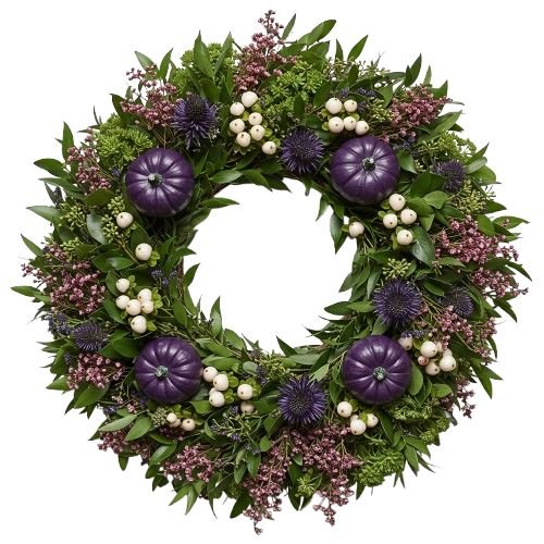 Add a touch of enchantment to your Halloween and autumn décor with our Enchanted Pumpkin Meadow Wreath. Handcrafted with a stunning mix of mini purple pumpkins, pink gypsophila, white snowberries, purple eryngium, and assorted greenery, this wreath captures the perfect balance of spooky elegance and seasonal charm.