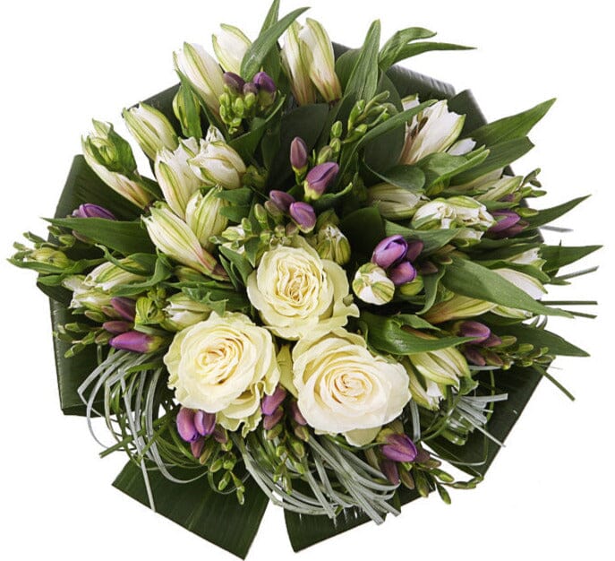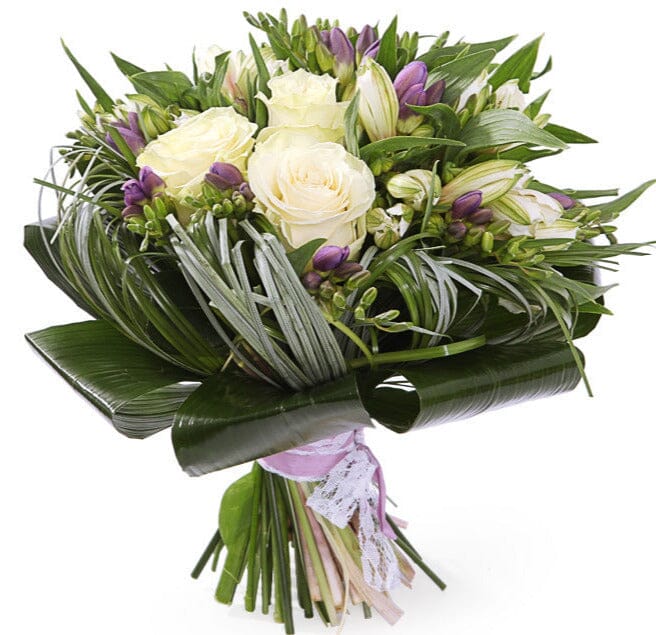 Introducing our enchanting Fairy Blossom Bouquet, a whimsical floral arrangement designed to captivate and delight. This bouquet blends the purity of white roses, the elegance of white alstroemeria, and the vibrant charm of purple freesias, all enhanced with lush bear grass and glossy aspidistra leaves for a refined, textured look.