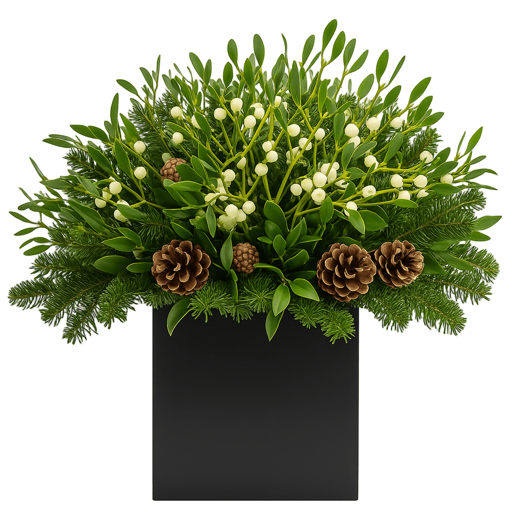 - Mistletoe: a beloved symbol of love, peace, and good fortune, mistletoe is the star of this festive arrangement. Its soft green leaves and white berries make it a cherished holiday element, bringing tradition and romance to the season.
