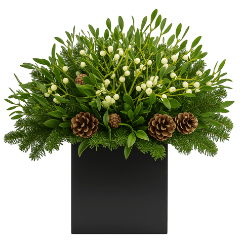 The Festive Elegance Box of Mistletoe and Cones is a charming and timeless holiday arrangement featuring mistletoe, natural cones, and fresh spruce. Its rustic winter style and traditional symbolism make it a meaningful seasonal decoration, perfect for spreading warmth, joy, and classic Christmas charm in any space. Whether gifted or displayed at home, it’s a beautiful way to celebrate the season. Celebrate the spirit of Christmas with our Festive Elegance Box of Mistletoe and Cones from Flowers Box London. This luxurious arrangement features classic mistletoe, pine cones, and festive greenery, beautifully presented in an elegant box. Perfect as a holiday gift or a stunning seasonal decoration, it captures the warmth and sophistication of the festive season. Handcrafted by our expert florists, this piece adds a touch of natural beauty and timeless style to your home. Order now for same-day delivery in London or next-day delivery across the UK.
