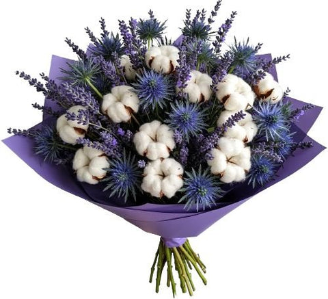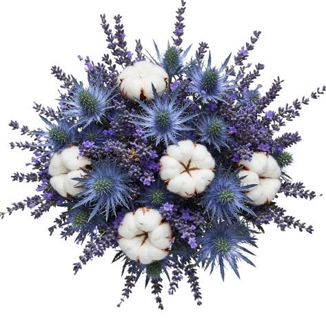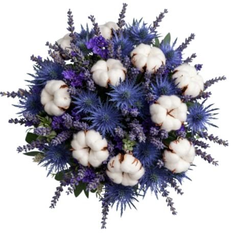 - Blue Eryngium: also known as sea holly, blue eryngium introduces texture, structure, and an unexpected edge. Its spiky, thistle-like blooms in shades of silvery blue contrast beautifully with the softness of cotton and the delicacy of lavender. Symbolizing independence and strength, eryngium grounds the bouquet with character and depth.