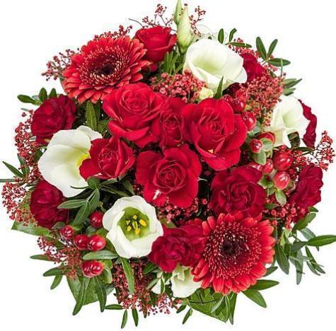 Stunning bouquet created from feminine colour red luxury roses, red gerbera and ivory lisianthus. Very romantic bouquet also suitable for other occasions.