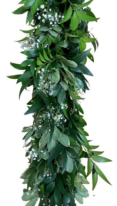 Crafted from lush foliage, our garland captures the enchanting beauty of nature, infusing your space with a whimsical charm. The airy grace of gypsophila blossoms intertwines beautifully with the rich greens of pittosporum and ruscus, creating a stunning visual impact.