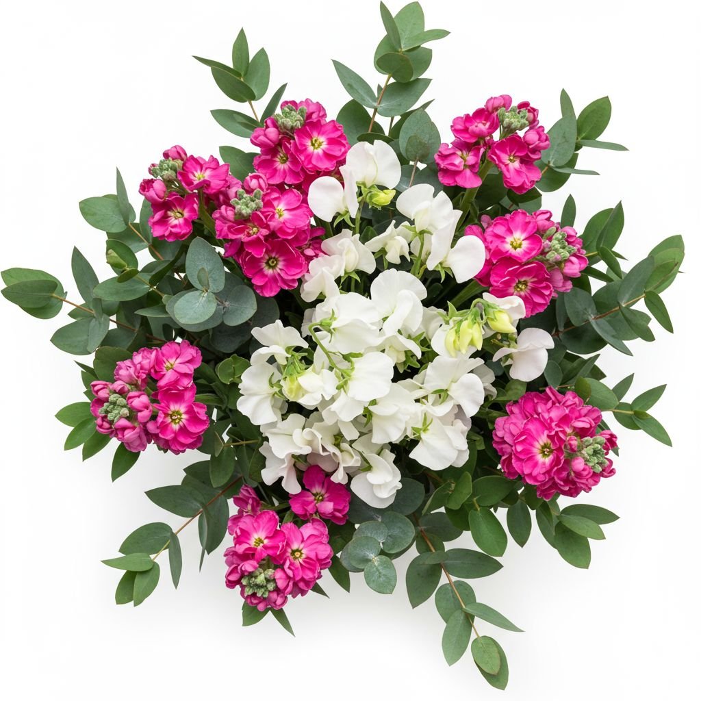 Experience timeless elegance and soft fragrance with our Fragrant Bouquet of Pink Stock and Sweet Pea. This beautifully arranged bouquet features lush, scented pink stock paired with delicate sweet pea in the color of your choice, accented by fresh, aromatic eucalyptus for a natural and soothing touch.