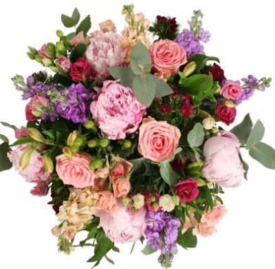 Pink peonies and roses add a romantic touch, while peach and lavender stock contribute warmth and elegance. Burgundy lisianthus provides a rich, deep contrast, and sweet William adds a playful element. Lush greenery ties the bouquet together, offering texture and depth. This bouquet is perfect for special occasions like anniversaries, birthdays, Mother's Day or any event where a luxurious and fragrant floral arrangement is desired. Its harmonious blend of colors and scents makes it a memorable gift that conveys love, admiration, and elegance.