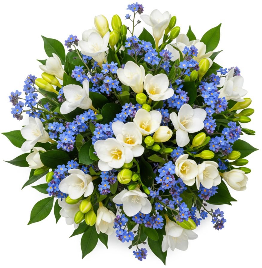 Perfect for birthdays, anniversaries, Mother’s Day, or simply to let someone know they’re in your thoughts, this bouquet blends freshness, color, and sentiment in a timeless floral design. Whether you’re celebrating a special moment or sending a gentle reminder that someone is loved and remembered, the Freesias and Blue Forget-Me-Not Bouquet is a perfect choice.