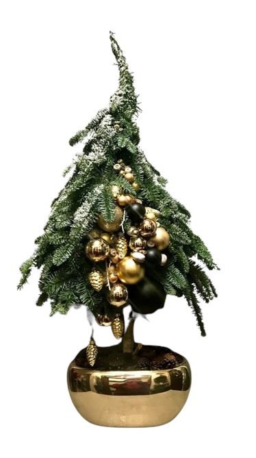 Embrace the magic of the season with the Fresh Spruce Holiday Tree Arrangement: Snow-Kissed with Modern Gold Touches, and let it bring warmth and joy to your home this holiday season!