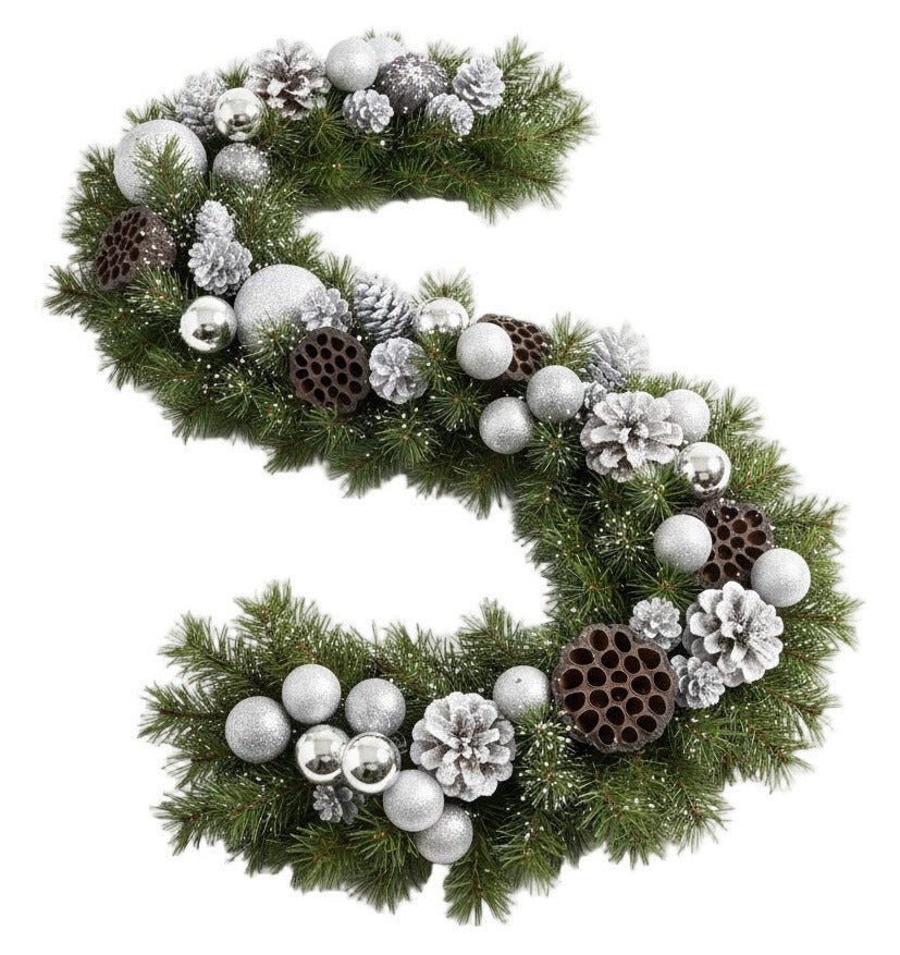 Bring winter magic home with our Frosted Forest Garland — fresh spruce, silver baubles, lotus pods, and cones dusted with artificial snow. The Frosted Forest Garland with Silver Baubles captures the elegance of a snowy winter forest. Handcrafted with fresh spruce, natural white cones, and lotus seed pods, this garland blends natural textures with a touch of holiday sparkle. The silver baubles and a soft layer of artificial snow create a shimmering, frosted look that perfectly complements any Christmas décor.