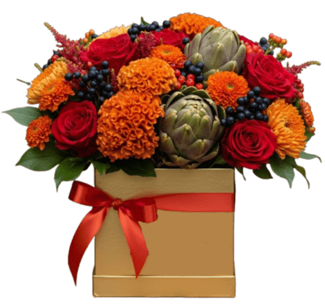 The Garden Autumn Box is a stunning floral arrangement that captures the rich, warm essence of the autumn season. Bursting with deep reds, fiery oranges, and earthy greens, this arrangement beautifully combines red roses, orange celosia, orange chrysanthemums, artichokes, red astilbe, black viburnum berries, red hypericum berries, and lush greenery. Perfect for fall centerpieces or thoughtful seasonal gifts, this box radiates warmth, texture, and natural charm. Celebrate the cozy charm of fall with the Garden Autumn Box, a stunning arrangement of seasonal blooms, foliage, and natural textures. Perfect for halloween centerpieces, autumn home décor, or thoughtful seasonal gifts, this box adds rich color and harvest elegance to any space. Keep your display fresh by placing it in a cool, shaded area and misting the floral foam regularly. Available from local florists, online flower shops, or as a fun DIY fall project, the Garden Autumn Box captures the magic of the season in every petal.