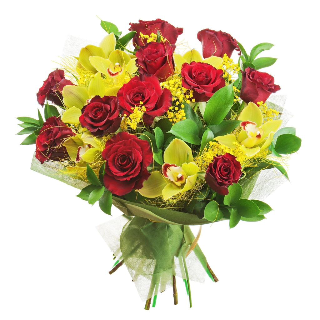 - Yellow Cymbidium Orchids: known for their exotic beauty and delicate petals, yellow cymbidium orchids represent strength, luxury, and joy, making them the perfect complement to the rich red roses.