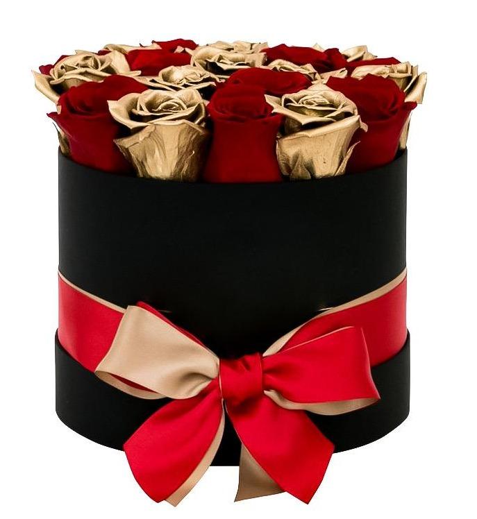 Elevate your gift-giving experience with our Gold and Red Roses Hat Box, a stunning and luxurious flowers arrangement that exudes elegance and sophistication. This exquisite design features vibrant red roses, symbolizing passionate love and romance, complemented by gold-painted roses, adding a touch of opulence and charm.