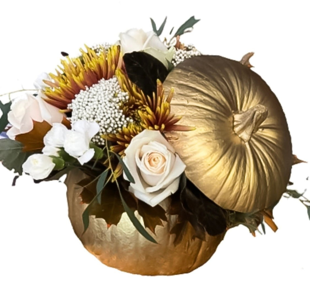 - Pumpkin (Painted Gold): At the heart of this arrangement is a charming pumpkin painted in a stunning gold finish. This decorative pumpkin serves as a unique centerpiece that embodies the spirit of autumn while adding a touch of glamour. It beautifully ties together the floral elements, making the entire bouquet visually cohesive and festive.