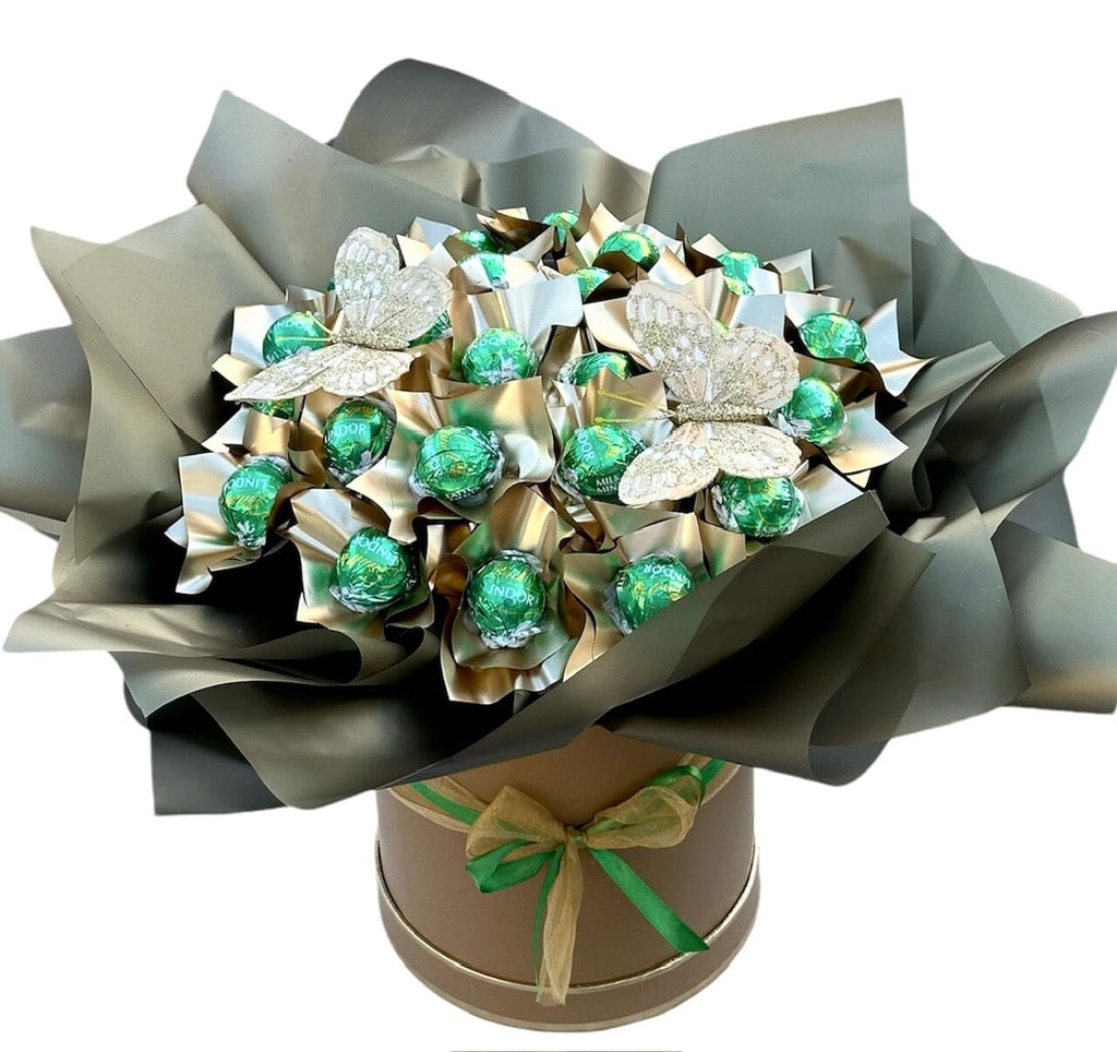 * The colour of the flower box and butterfly will be selected by the head florist - best suited to the chocolate arrangement. However, if you want to choose for yourself, please write to us on Facebook or by email: info@flowersbox.co.uk