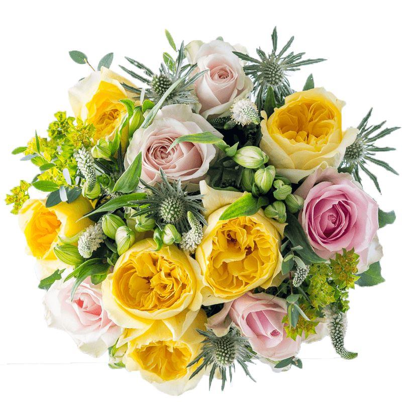 - Silver Eryngium: eryngium's silver-blue hues provide a stunning contrast to the soft pastel shades, giving the bouquet a unique and textured appearance.