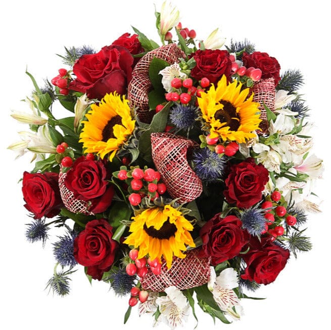 Brighten someone’s day with our Gorgeous Bouquet of Sunflowers and Red Roses, a striking floral arrangement full of color, warmth, and elegance. This bouquet features radiant yellow sunflowers and rich red roses, beautifully complemented by white alstroemeria, red hypericum, blue eryngium, and fresh greenery for added texture and balance.